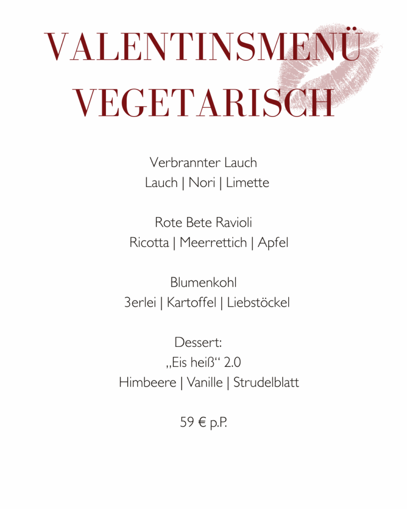 VALENTINSDINNER – MORE AMORE – 14. FEBRUAR 2026 19.00h | Genießt ein exquisites, romantisches 4-Gänge Menü. Ein Abend voller Genuss und Augenblicke, die verbinden. Inkl. Apéritiv 69 € p.P. | 59 € p.P. Vegetarisches Menü